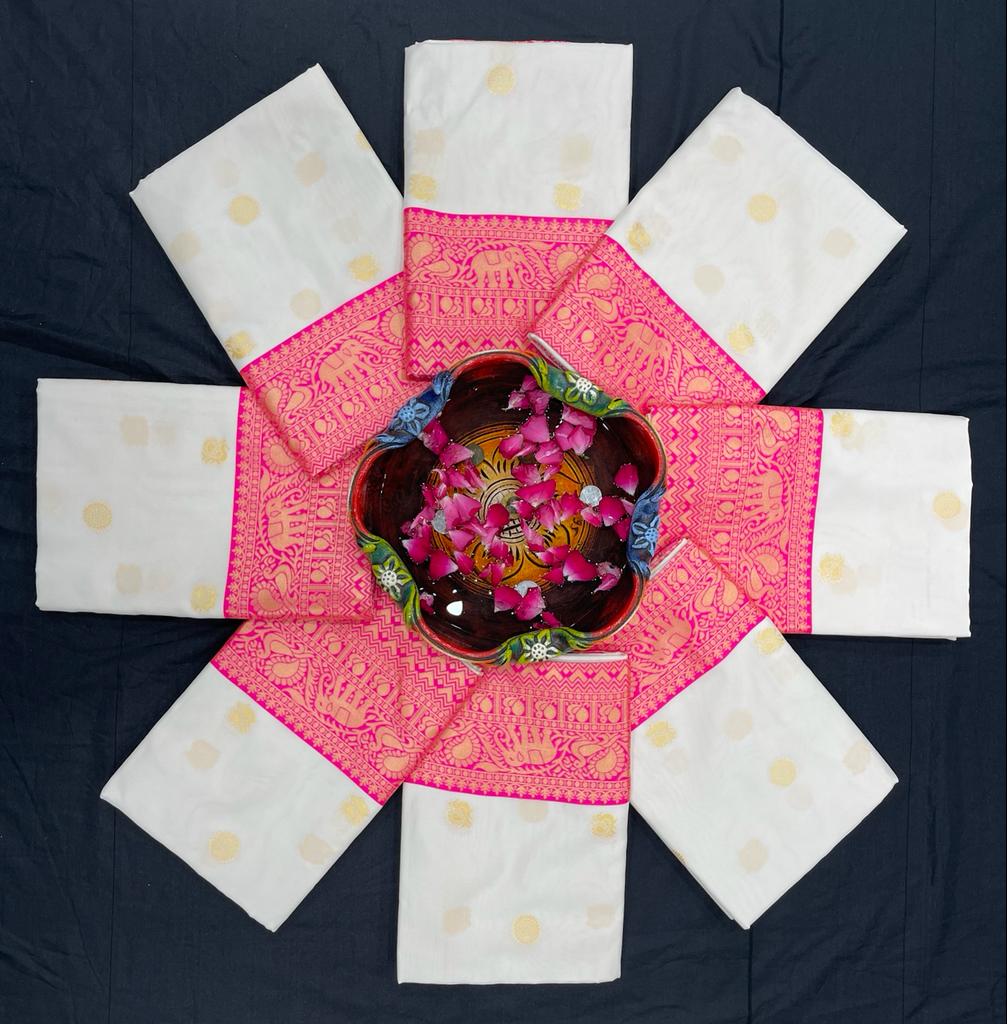 Design & Color: The body of the saree for women features a beautiful cream or off-white hue, adorned with delicate woven gold motifs. This elegant canvas is beautifully framed by a broad and vibrant pink border, which is intricately detailed with traditional gold patterns. The accompanying blouse piece is in a striking hot pink, offering a perfect contrast and the opportunity for personalized silk saree blouse designs.